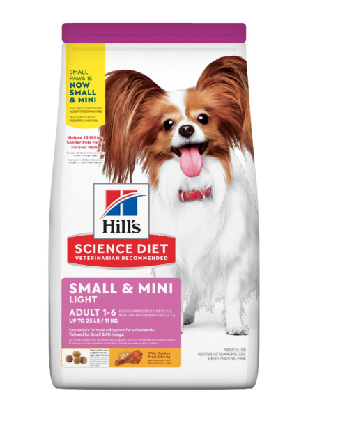 Grande en amor, pequeño en tamaño.™ El alimento para perros Hill’s® Science Diet® Small Paws™ Light Adult es nutrición diseñada para perros adultos de raza pequeña o miniatura, menos activos que requieren un alimento bajo en calorías para ayudarlos a conservar un peso y estilo de vida sanos. Especialmente hecho en bocados de tamaño pequeñito. Las bajas calorías y la L-carnitina ayudan a promover un peso corporal idea, a favorecer una movilidad sana y mantener la función cardiaca La proteína de alta calidad y las fibras naturales ayudan a satisfacer el apetito entre comidas Mezcla nutritiva de omega-6 y vitamina E para una piel sana y un pelaje de lujo Contiene nuestra mezcla antioxidante especial Small & Mini para un soporte inmunológico de por vida