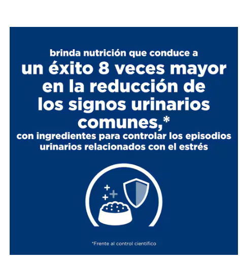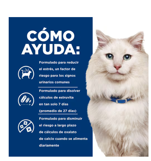 Formulado para reducir el estrés, un factor de riesgo de los signos urinarios comunesFormulado para disolver los cálculos de estruvita en tan solo 7 días (promedio de 27 días)Formulado para disminuir el riesgo a largo plazo de cálculos de oxalato de calcio cuando se alimenta diariamenteS+OXSHIELD: Formulado para promover un ambiente urinario que reduce el riesgo de desarrollar estruvita & cristales de oxalato de calcioRecomendado para la alimentación de gatos adultos durante toda su vida