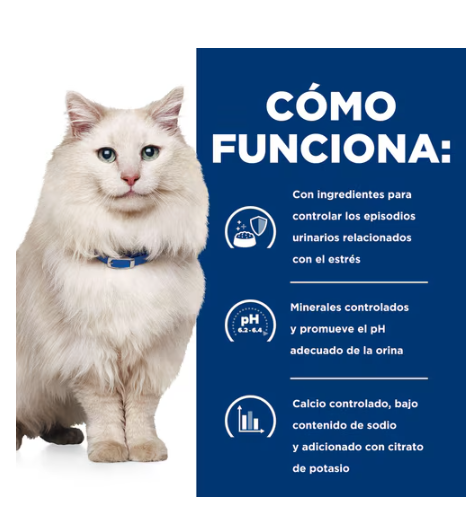 Con ingredientes para controlar los episodios urinarios relacionados con el estrés Minerales controlados y promueve el pH deseable de la orina Calcio controlado, bajo contenido de sodio y citrato de potasio añadido