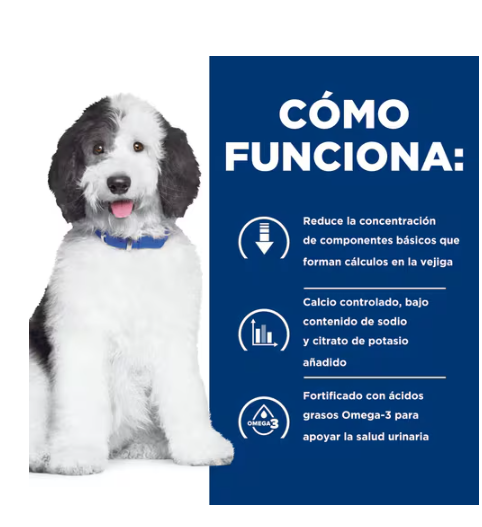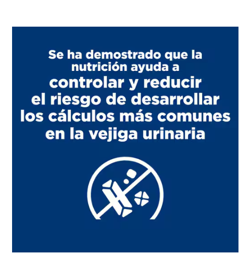Ayuda a reducir la concentración de componentes básicos para los cálculos en la vejiga Calcio controlado, bajo contenido de sodio y citrato de potasio añadido Fortificado con ácidos grasos Omega-3 para apoyar la salud urinaria