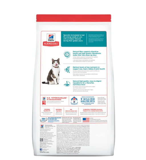 El alimento seco para gatos Hill's™ Science Diet™ Indoor Adult 11+ está especialmente formulado para para satisfacer las necesidades de energía de gatos con un estilo de vida de interiores durante sus años dorados.